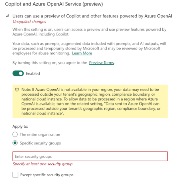 - Data sent to Azure OpenAI can be processed outside the tenant’s geographic region, compliance boundary, or national cloud instance. (This option is only needed if your tenant is not in US or France)