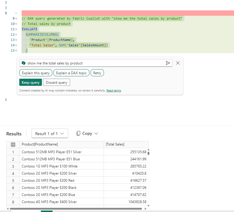 In the DAX query section and through the Quick Measure option, Copilot can assist in generating measures based on your data model and its extensive knowledge base. You can also refine your query by requesting additional information or adjustments.