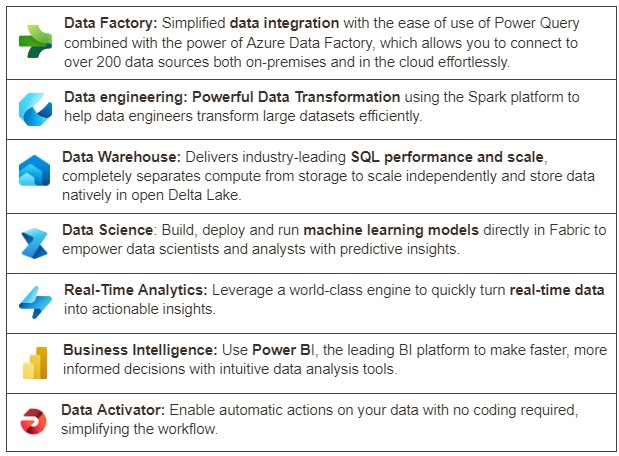 Microsoft Fabric offers seven key experiences tailored to different roles within an organization, making it easy for users to access the analytics tools they need. These experiences are: