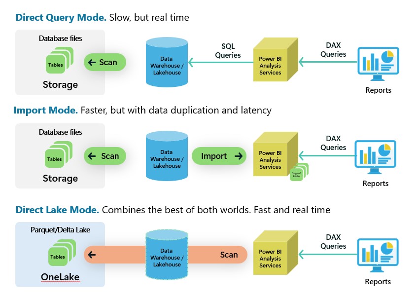 Direct Lake is a new type of dataset introduced in Microsoft Fabric. It combines the performance benefits of import mode and DirectQuery by reading data directly from Delta files within the lakehouse and data warehouse. This eliminates ingestion time, refresh schedules, and data latency ensuring real-time data access with optimal performance. Note that Direct Lake requires Power BI Premium P or Fabric F SKU capacities.