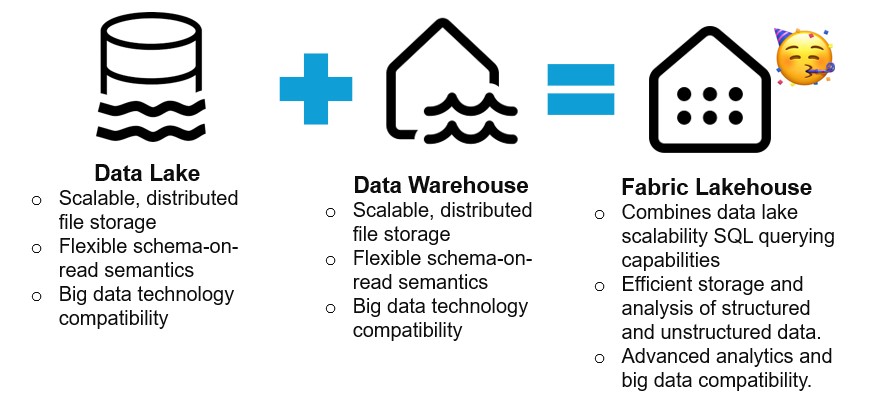- Lakehouse: A storage solution for big data, used for cleaning, querying, reporting, and sharing data.