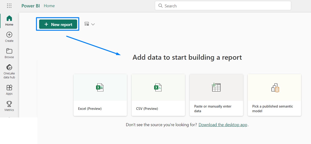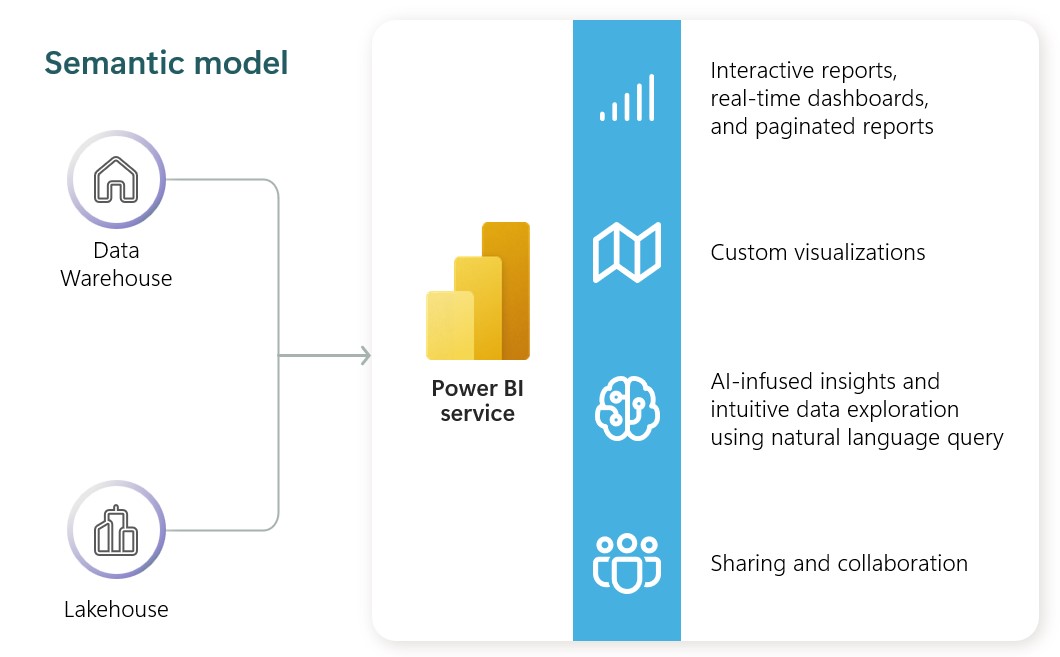 - Power BI Report: You can build Power BI reports directly from the Power BI experience or from various Fabric experiences. Reports can be created using data from Fabric lakehouses, data warehouses, SQL endpoints, and more.