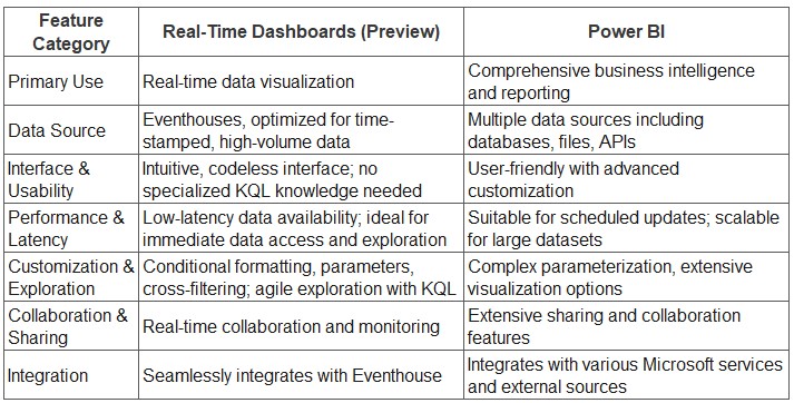 In summary, choose Real-Time Dashboards for real-time data access and exploration, optimized for high-volume, fast-flowing data, and easy to use without KQL expertise and Power BI for complex reporting and analysis, supporting multiple data sources and extensive customization.