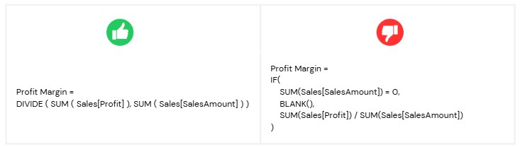 IF(SUM(Sales[SalesAmount]) = 0, BLANK(), SUM(Sales[Profit]) / SUM(Sales[SalesAmount]))