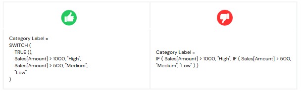 Nested IF statements can make your DAX code complex, harder to read, and more difficult to maintain. Instead, use the SWITCH function for scenarios with multiple conditions. SWITCH improves readability, simplifies logic, and enhances maintainability while offering comparable performance.