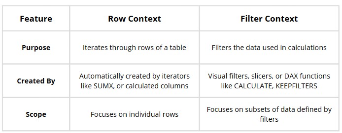 DAX operates in two primary contexts: Row Context and Filter Context and understanding these concepts is essential for writing accurate and optimized formulas as misinterpreting these contexts can result in incorrect results or performance bottlenecks.