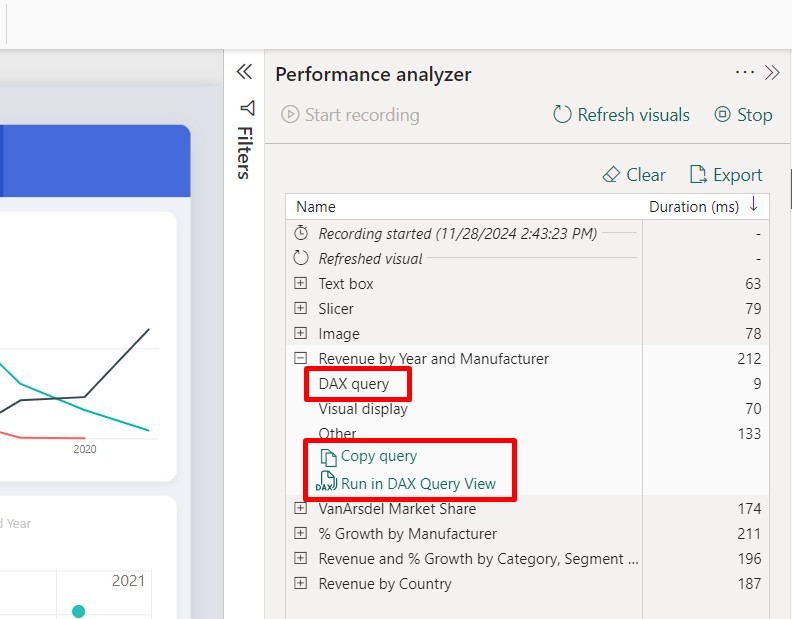 6. Optimize DAX queries with longest query times, for this click Copy Query to copy the DAX formula and troubleshoot it in DAX studio or run in DAX query view, where you can write and execute the DAX queries directly against semantic models.