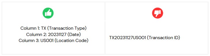 TransactionIDorUserIDoften contain unique identifiers that are often composed of multiple meaningful components (e.g., prefixes, regions, or batch numbers). These columns can be split extracting meaningful components from the IDs and store them in separate columns. This helps reduce the unique values within each column, improving compression and performance. For example: