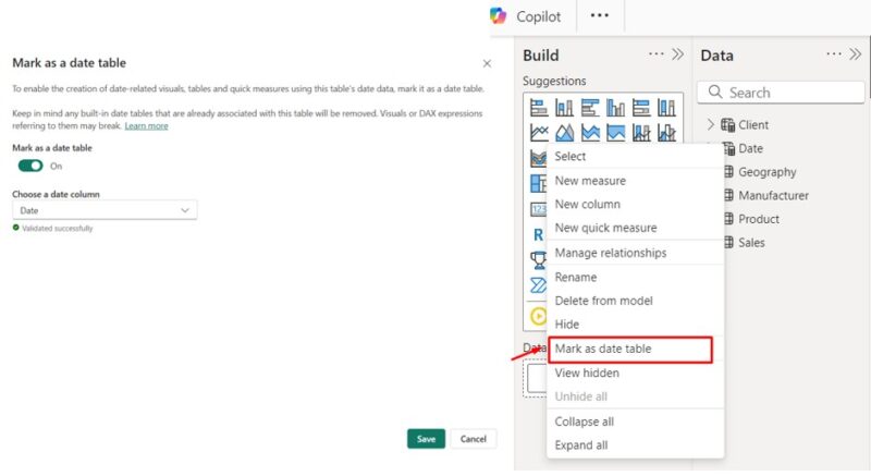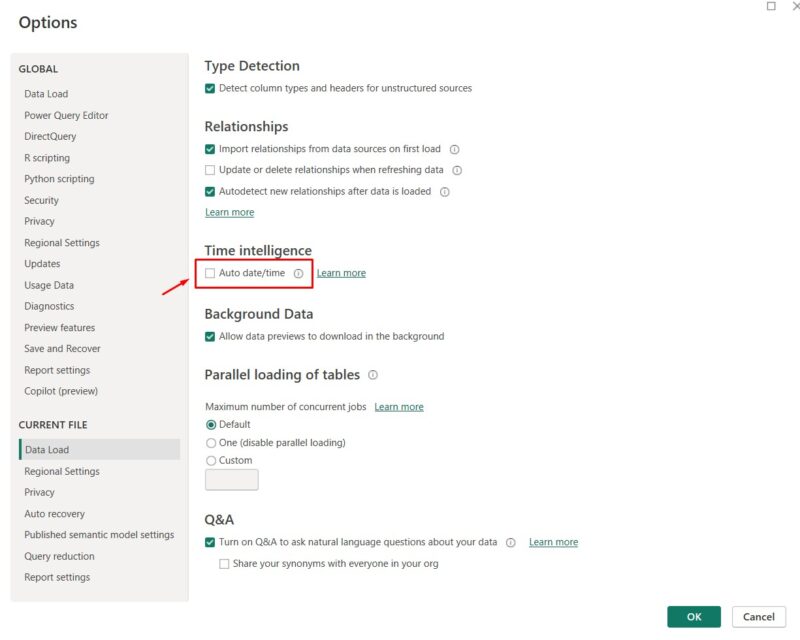 Disable Power BI’s auto-date/time hierarchy for better control and to reduce model size. Instead, use a custom Date table with manual hierarchies.