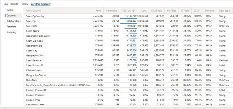 Size Information: Displays the memory usage of each table and column in the model, helping you identify where the most memory is being consumed. Focus on removing non-essential columns, especially those that occupy significant space, to reduce the size of your data model.