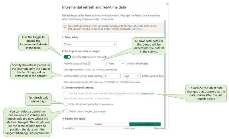 For larger datasets, full refreshes can become time-consuming and resource-intensive. Configuring incremental refresh allows Power BI to refresh only new or changed data, significantly improving efficiency.