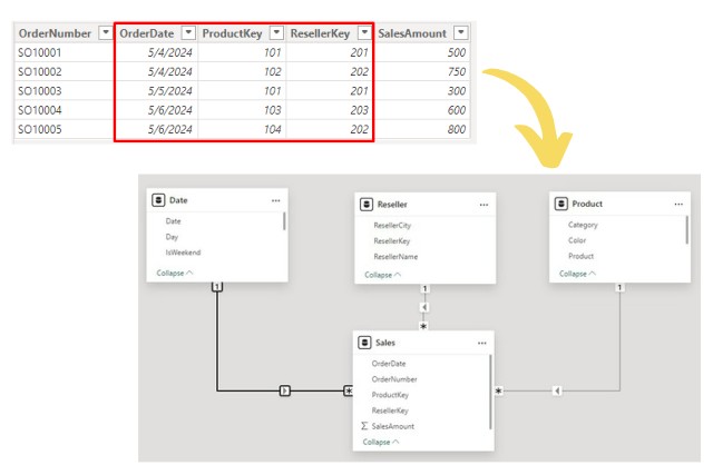- Fact tables: Store numerical data and are connected to dimension tables via foreign keys.