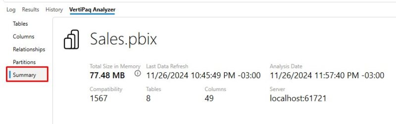 Summary Information: Located under the Summary tab, this section provides an overview of the model, including its total size, as well as the number of tables and columns it contains.