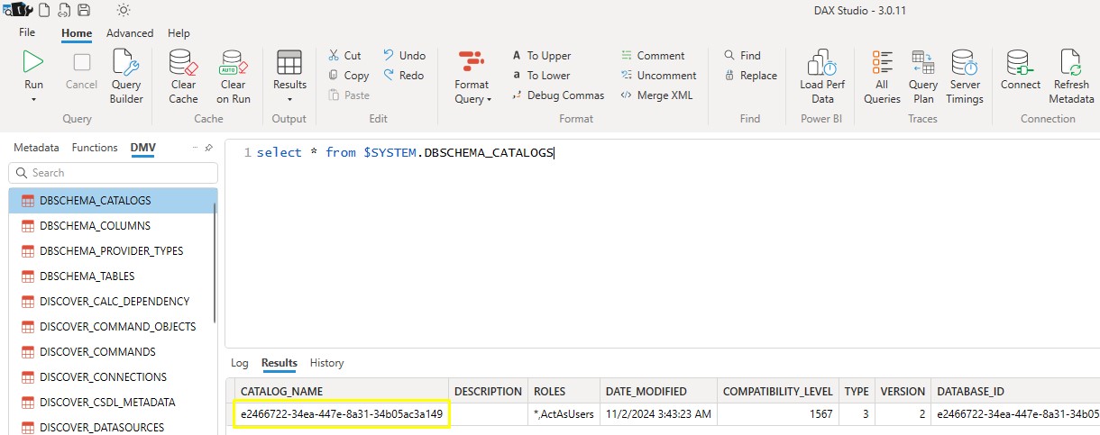 4. Run the DMV query SELECT * FROM $SYSTEM.DBSCHEMA_CATALOGS in DAX Studio to get the database GUID: