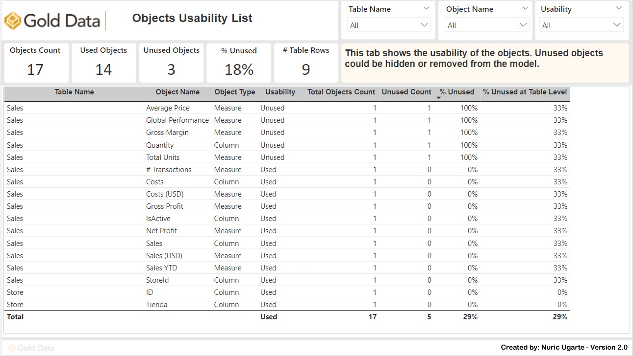 This tab provides an overview of the usability of all objects within the data model. It is designed to help you identify and manage unused objects. This tab helps you make informed decisions about which objects can be hidden or removed to improve performance and simplify your model without disrupting functionality.