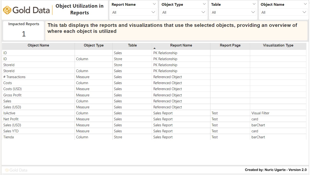 • Report-Level Usage: Identify the reports, pages, and visuals that rely on specific objects.