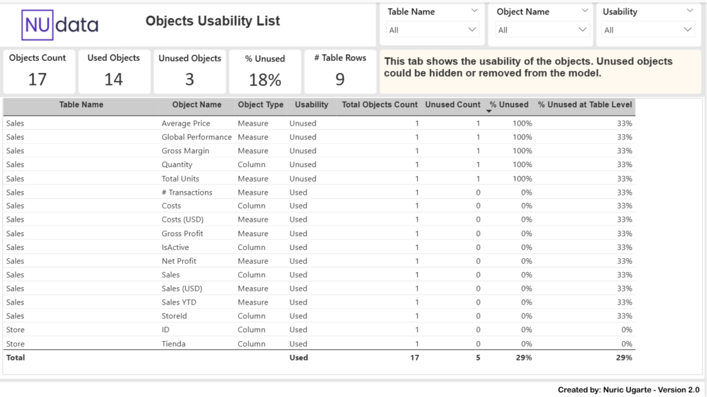 This tab provides an overview of the usability of all objects within the data model. It is designed to help you identify and manage unused objects. This tab helps you make informed decisions about which objects can be hidden or removed to improve performance and simplify your model without disrupting functionality.