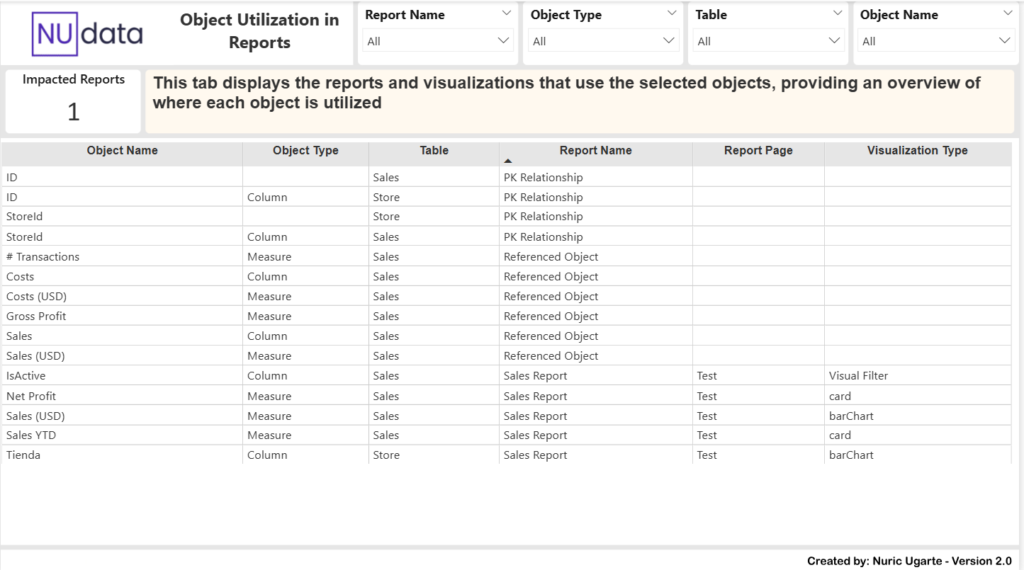 - Report-Level Usage: Identify the reports, pages, and visuals that rely on specific objects.